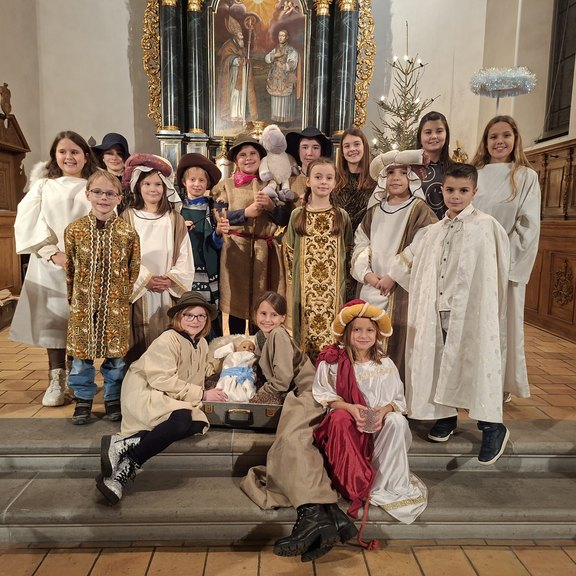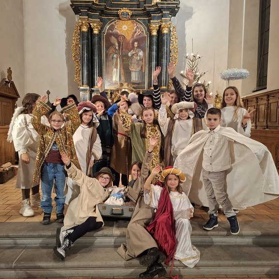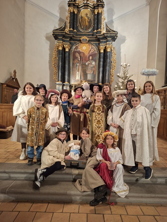 Im ökumenischen Weihnachtsgottesdienst gestalteten Kinder und Jugendliche das diesjährige Krippenspiel auf kreative und lebendige Weise. Ausgehend von der Weihnachtsgeschichte wurde gezeigt, wie die Geburt Jesu Menschen berührt und verändert. Mit einfachen Mitteln, wechselnden Rollen und passenden Verkleidungen aus Koffern entstand Szene für Szene ein eindrückliches Bild der Weihnachtsbotschaft. Jede Szene wurde mit einem passenden Lied unterstrichen.