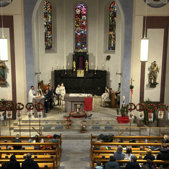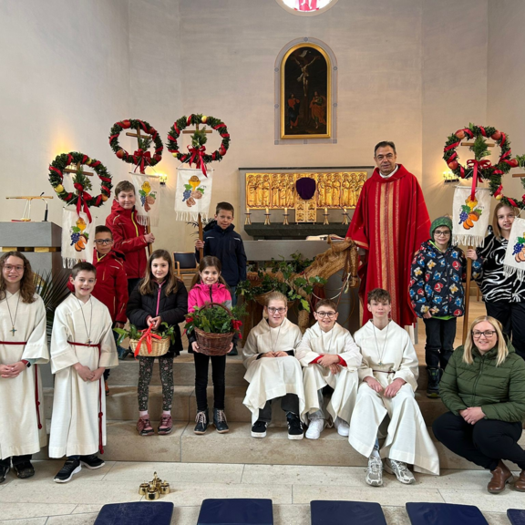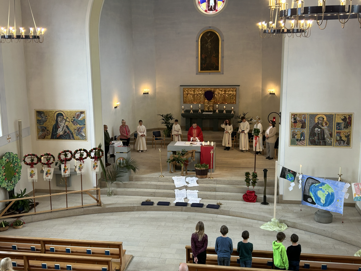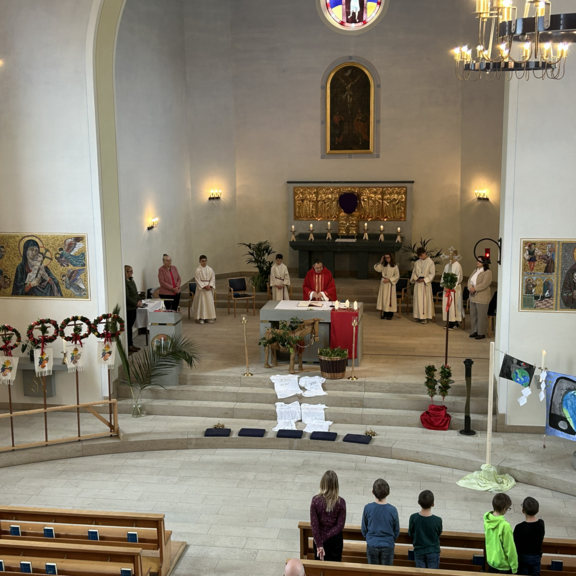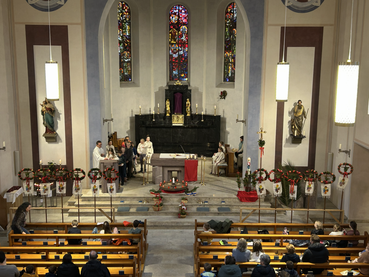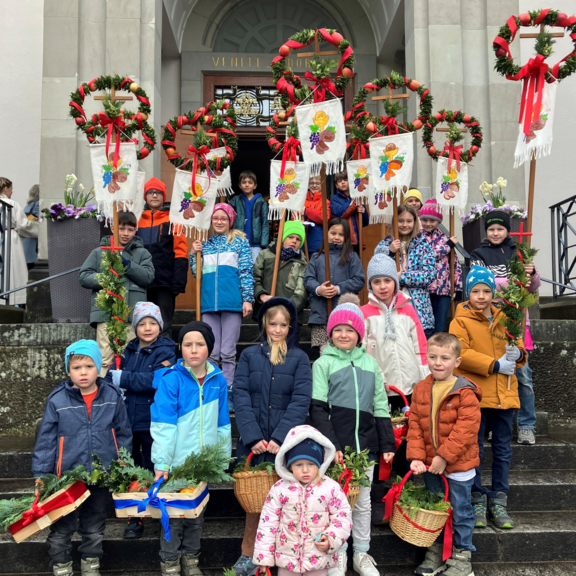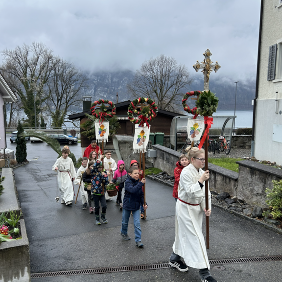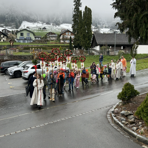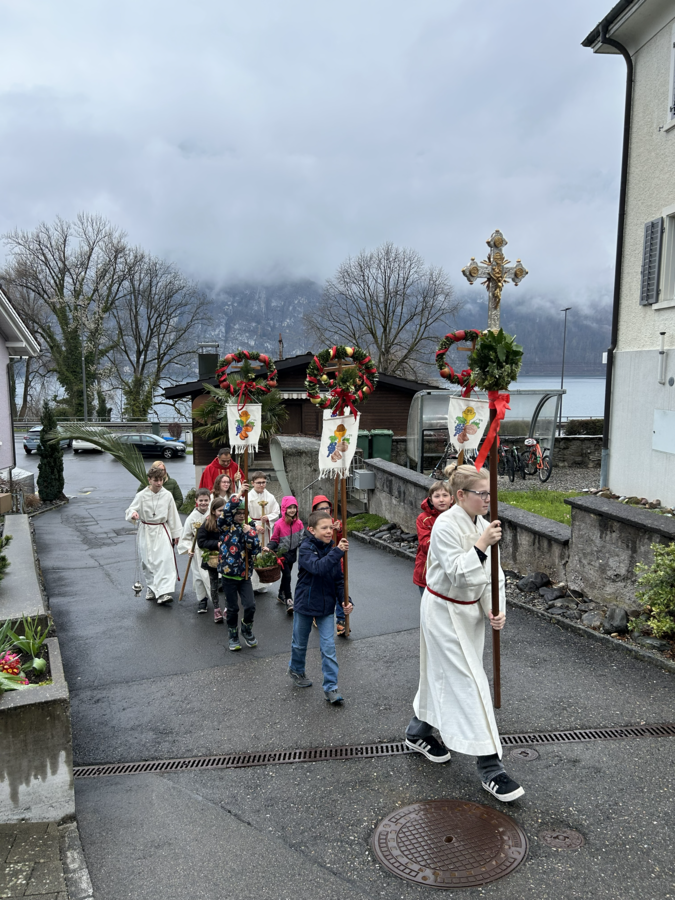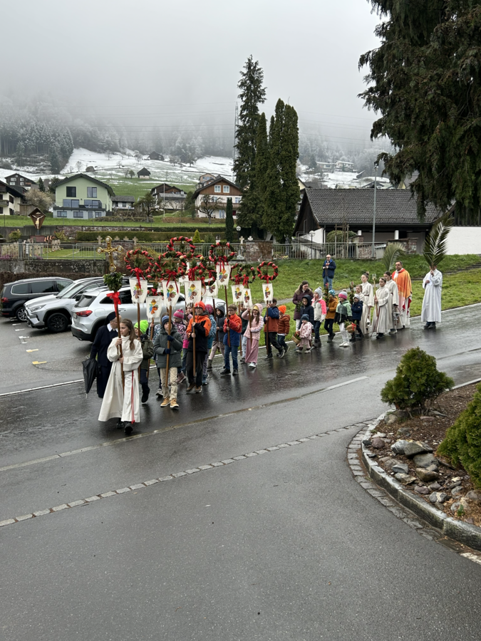 Mit Marschklängen voran, zog die Musikgesellschaft, die Erstkommunionkinder, Primarschüler und noch jüngere Kinder am vergangenen Palmsonntag Richtung Hauptportal der Pfarrkirche, wo Pfarrer Marku die schönen Palmkreuze und -körbchen segnete. Im anschliessenden Gottesdienst, mitgestaltet von den Drittklässlern, hörte die Gemeinde, wie es um Jesus herum immer ‘dunkler’ wurde und schliesslich aus einem ‘Hosianna’ ein ‘Kreuzige ihn’ wurde.