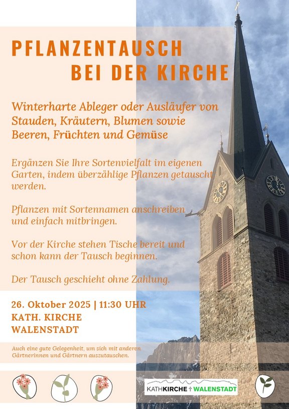 Nach dem Gottesdienst können auf dem Kirchenplatz Walenstadt wieder Pflanzen getauscht werden. Winterharte Stauden, Kräuter, Blumen sowie Beeren, Früchte und Gemüse bilden teilweise sehr grosszügige Ausläufer oder Ableger.