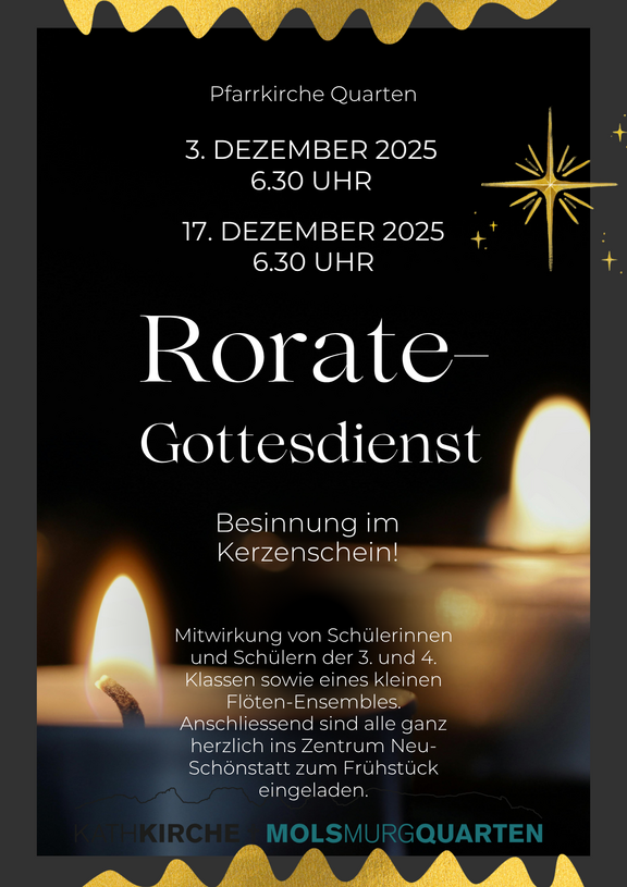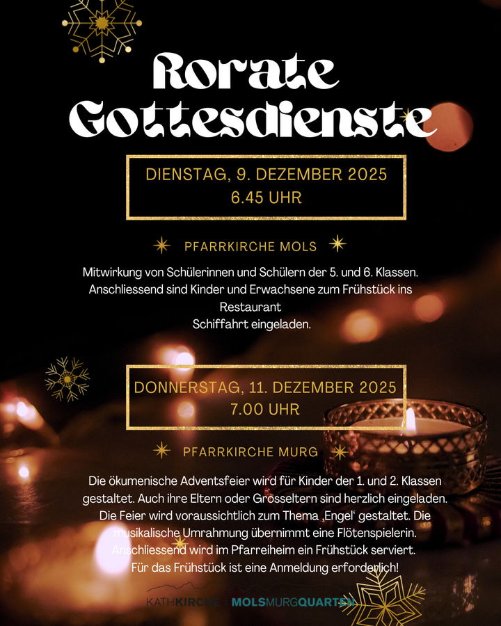 Die ökumenische Adventsfeier wird für Kinder der 1. und 2. Klassen gestaltet. Auch ihre Eltern oder Grosseltern sind herzlich eingeladen. Die Feier wird vor-aussichtlich zum Thema ‚Engel‘ gestaltet. Die musikalische Umrahmung über-nimmt eine Flötenspielerin. Anschliessend wird im Pfarreiheim ein Frühstück serviert. Um das Frühstück zu organisieren, haben die Kinder einen Anmeldeflyer via Schule nach Hause gebracht. Anmeldung bitte bis Ende November den Lehrpersonen abgeben. Herzlichen Dank!
