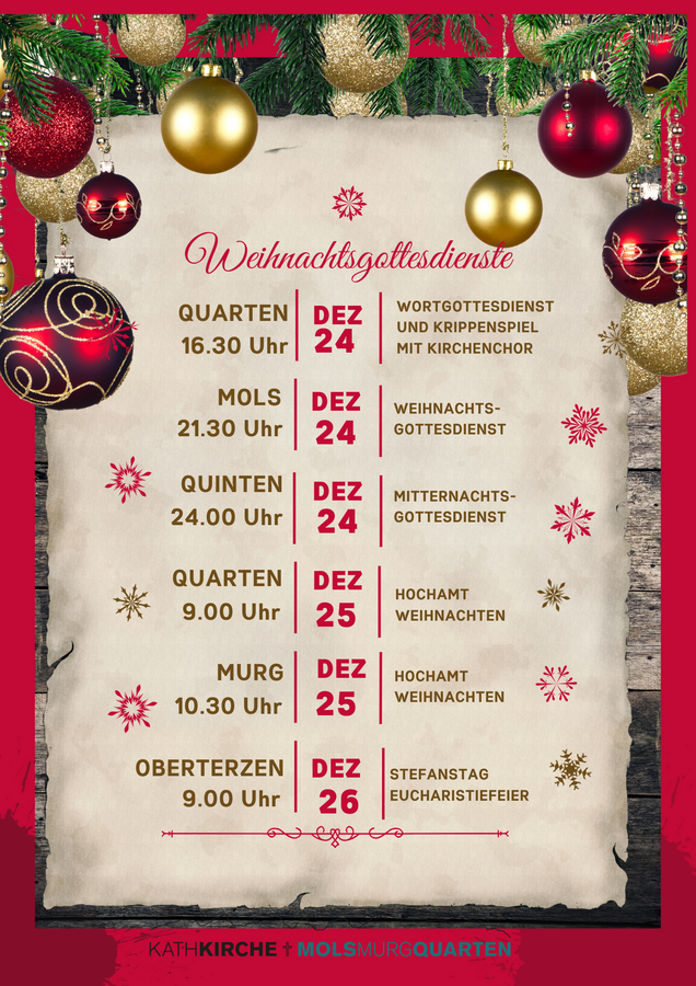 In diesem weihnachtlichen Familien-Wortgottesdienst werden 3.-Klass-Kinder ein einfaches, bibelbezogenes Krippenspiel aufführen, das musikalisch von Flötenmelodien und rhythmischen Marimba-Klängen begleitet wird. Der Gottesdienst wird gesanglich mit weihnachtlichen Liedern vom erweiterten Kirchenchor umrahmt. Die Gestaltung dieses Weihnachtsgottesdienstes erfolgt ohne Kommunionfeier und dauert knapp 60 Minuten.